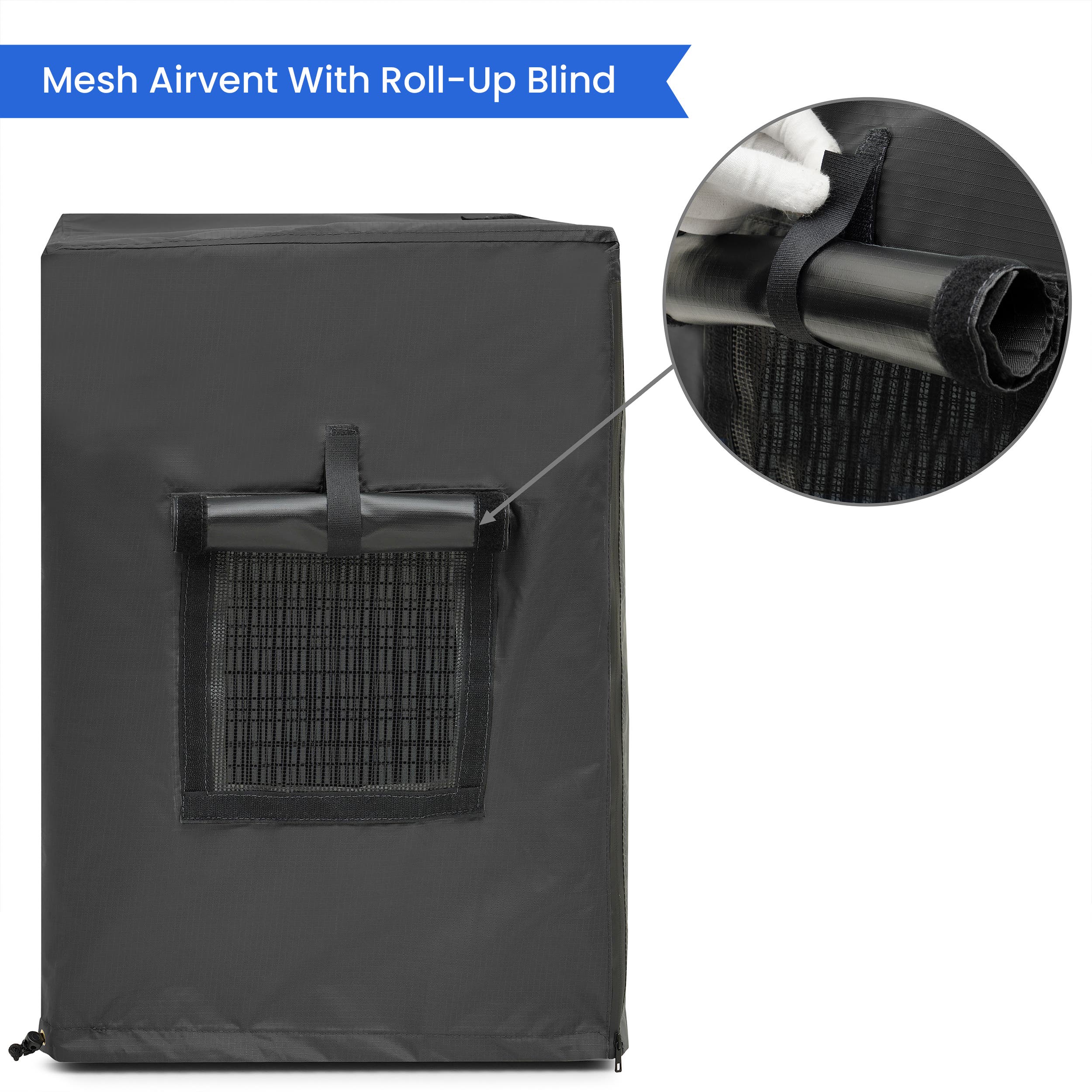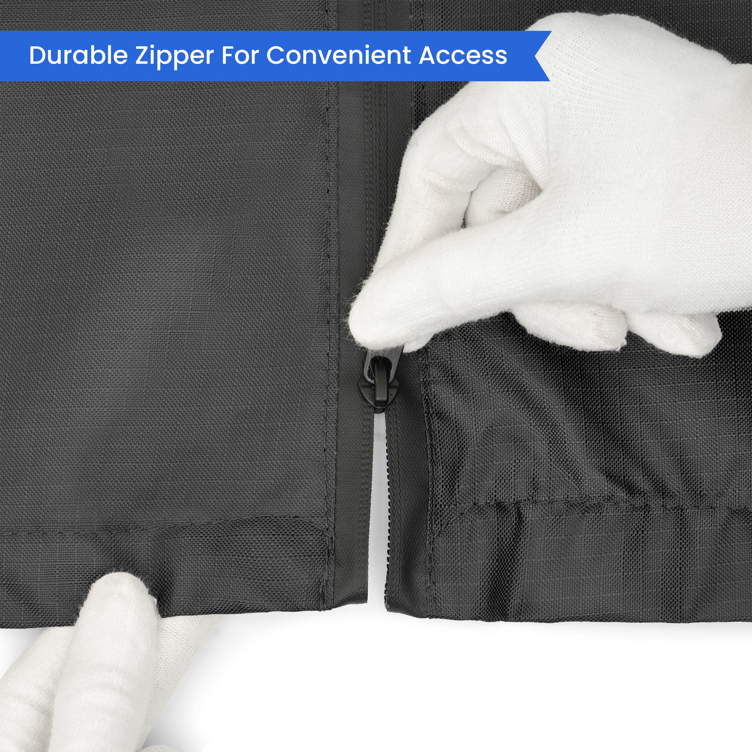 - Ripstop - A lightweight yet highly durable 6 oz 100% blockout Ripstop material, designed for moderate water, UV, and mildew resistance. Perfect for moderate weather conditions, this fabric is fade-resistant, tear-resistant, and abrasion-resistant. It also features air vents and side handles, ensuring effortless handling and enhanced airflow.