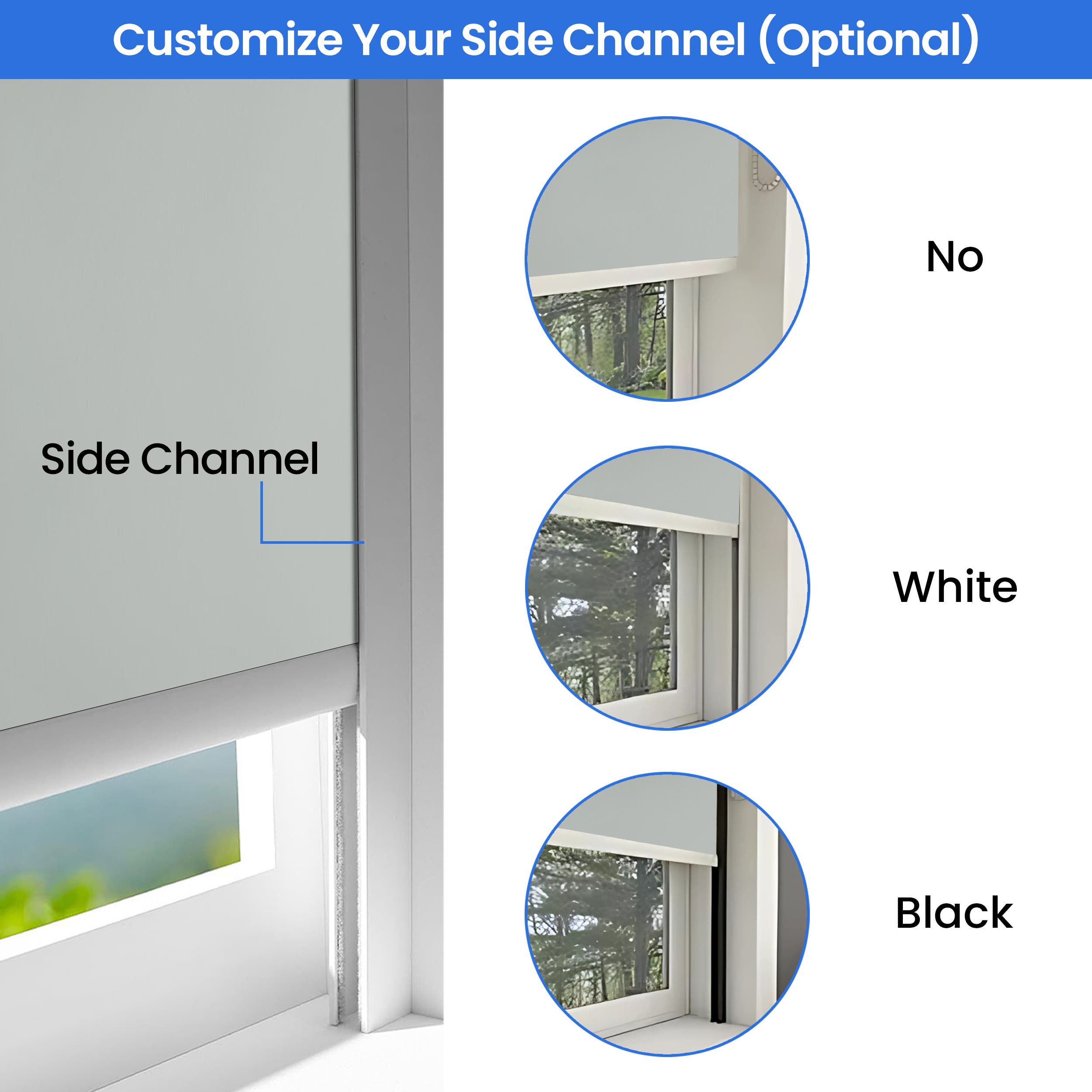 Tailor your blackout shades for windows with flexible mounting configurations - choose between inside or outside mount installations. Select your preferred operation method: classic white nylon bead chain, premium chrome-finish metal chain, or advanced motorized roller shades with remote control and charging cable. Customize control placement on either side, with fabric rolling from the front or back. Enhance functionality with white or black bottom bars and optional matching valances in aluminum construction. Add optional side channels for complete light elimination. For lengths beyond 7.5', channels are provided in two equal sections for easy handling.