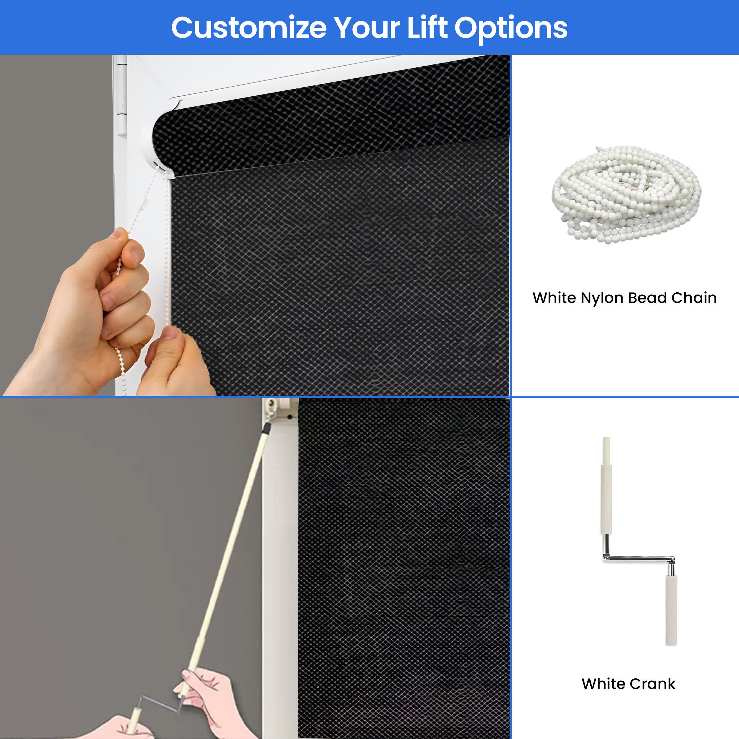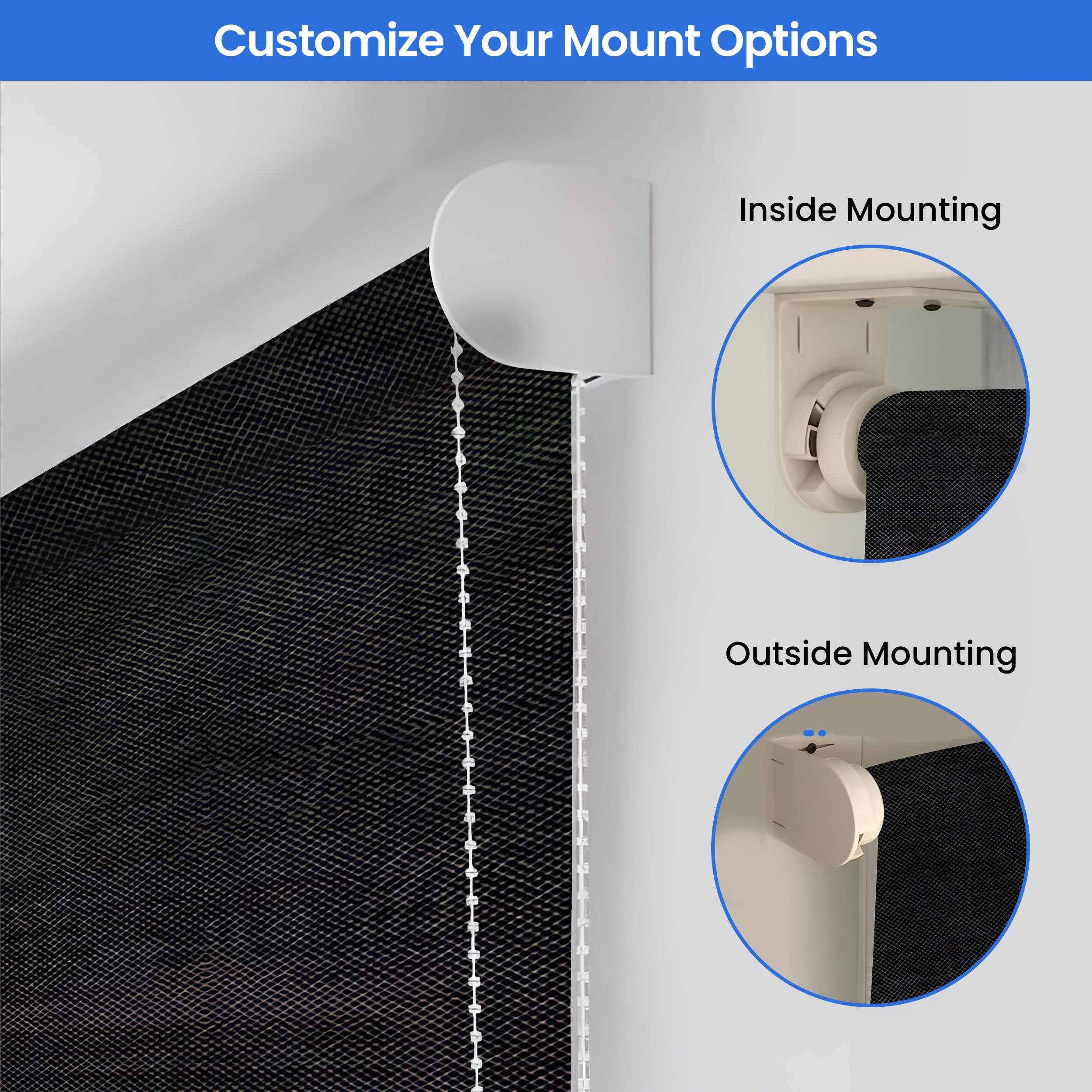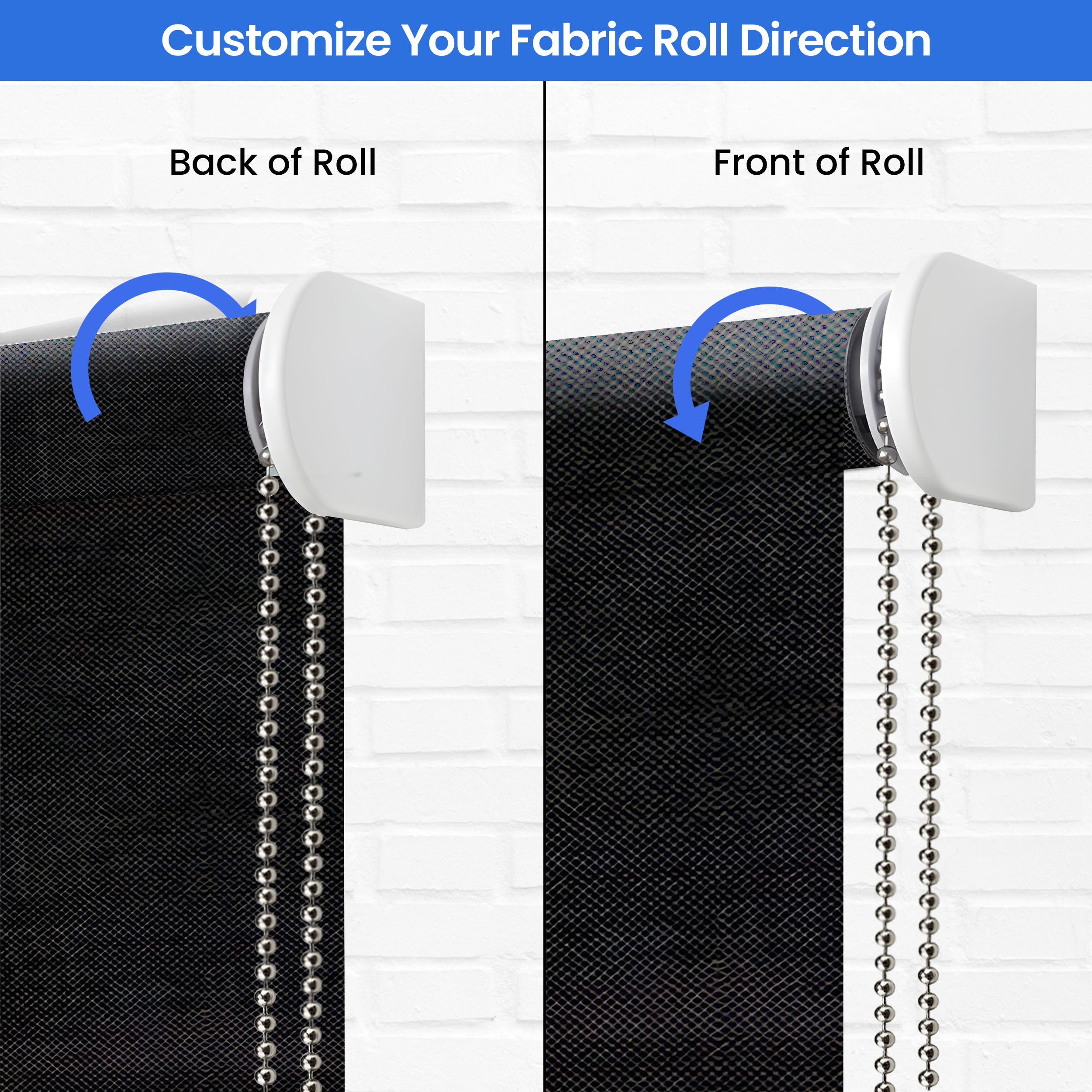 Tailor your shades with our flexible installation options, choosing from inside or outside mounts to fit your specific needs. Control mechanisms include a durable white nylon bead chain or a robust aluminum crank, positioned on the right or left to suit your preference. Additionally, you can specify the fabric roll direction, either from the front of the roll or from the back, enhancing the functional aesthetics of the shades. These customization options ensure the shades integrate seamlessly into your outdoor areas.