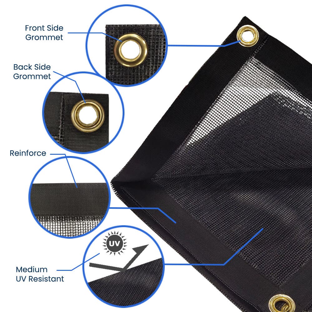 Crafted from Tarp Mesh, this tarp is constructed with durable 1000 denier PVC-coated polyester for strength and flexibility. Its 20 mil thickness, 6 oz material weight, and 50% openness ensure ventilation while maintaining privacy. The mildew-resistant fabric prevents moisture buildup, ensuring durability in humid conditions. Reinforced with double-thick hems and rust-free brass grommets spaced at every 24", it offers secure tie-downs for heavy-duty uses. Whether used as dump trailer mesh tarps or to create effective shade barriers, its polished design and same color on both sides ensure practicality and style for various applications.