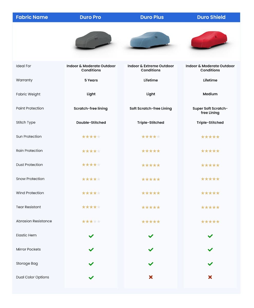 Your made-to-order car cover comes with a complimentary storage bag designed to fit the cover perfectly. Just fold, pack & store until you need it next, your cover’s storage bag will help you keep it sorted.