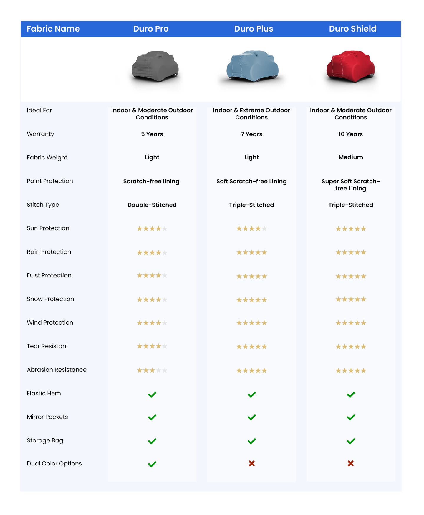 Our made-to-order covers are available with premium double-stitched seams. The double stitch seams not only ensure a great fit with full coverage, but also enhace the durability for long-lasting protection.