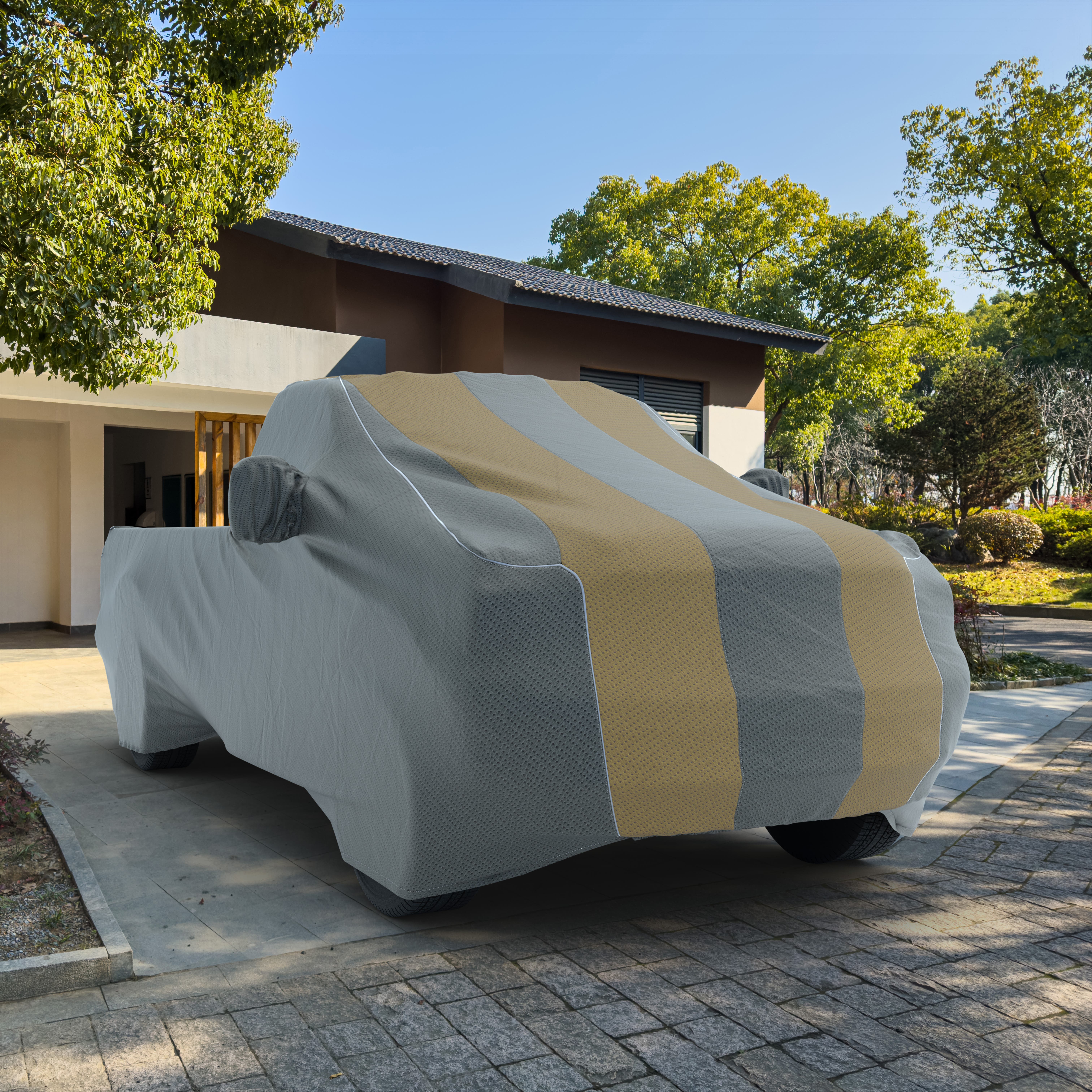 Protect your GMC Sierra 1500HD Classic with our custom-designed truck cover, specifically engineered for this heavy-duty pickup. The cover is crafted from ultra-durable, water-resistant material that can withstand the harshest conditions, including intense UV rays, dust, and environmental pollutants. Inside, a soft lining gently cradles your truck's substantial frame, preventing any scratches or abrasions. The precision-fit design accommodates various configurations, featuring integrated mirror pockets and an extra-large elastic hem for a secure fit. UV-resistant properties prevent your truck’s paint from fading and the interior from deteriorating, while the breathable fabric ensures that moisture doesn’t accumulate. Reinforced with heavy-duty seams, wind-resistant straps, and reflective strips, this cover is ideal for both active work sites and long-term storage. It helps maintain your Sierra 1500HD Classic's powerful presence and value, and comes with a free storage bag for easy handling.