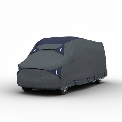 Secure your Class B RV with our high-performance Covers, crafted from premium materials Cover Rite and Duro Pro. Choose the all-Cover Rite version for comprehensive water resistance, or opt for Duro Pro - the hybrid with a Cover Rite top and Duro Pro side panel, blending strength and protection. Designed to enhance airflow, our Covers feature a mesh fabric and a 3" reflective strip to improve visibility and safety. They defend against harsh elements, oxidation, and fading, while preventing mold and mildew, thereby reducing maintenance efforts. Our Covers also shield your RV's interior from sun damage, preserving its value and appearance. Tailored for a perfect fit, our Covers include a free storage bag, patch kit, and optional ladder cap. The adjustable tension panels and robust straps ensure a secure setup. Also, you can get ultimate protection with our Class A RV Covers, Class C RV Covers, and Travel Trailer Cover designed for durability and perfect fit. Customize your Cover with choices in size, color, and logos, adapting to your unique style and needs, making it an essential for any RV owner.